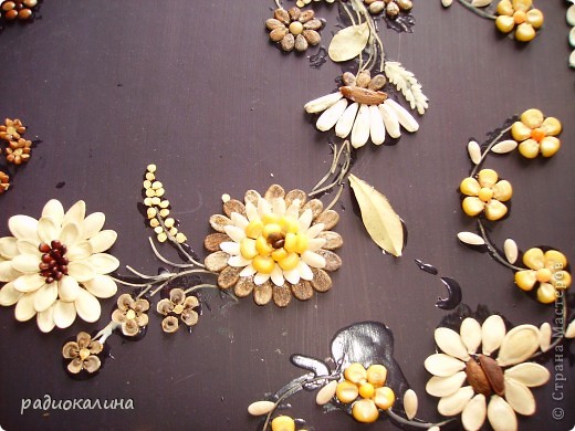 Ще минулого року сайту "Страна мастеров" захомячила соб дейку Панно "Осннй вальс" ( з насння круп)Чотири квтки по краям фанерки - з насння гарбуза, серцевинка - квасоля, маленьк жовт квтки - кукурудза, як з"днан мж собою макаронами, В середин квти з усх круп як подобаються - гарбуз, кабачок, кавун, диня, перець т.д. Ближче:Метелик всередин з насння гарбузаКому охота повторити цей шедевр,